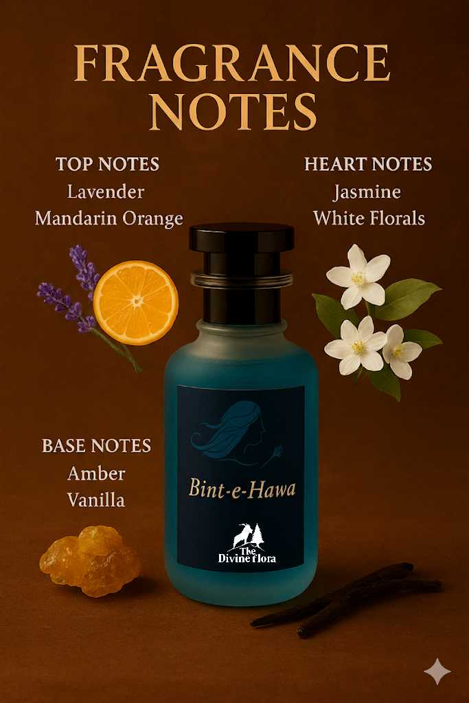 Bint-e-Hawa is a powerful yet graceful scent for women who embrace independence. Lavender and mandarin open this perfume with brightness and energy, flowing into a heart of jasmine and white florals. Vanilla and amber add depth, warmth, and sensuality. It’s an elegant expression of confidence, freedom, and femininity — a true signature fragrance for modern women.
