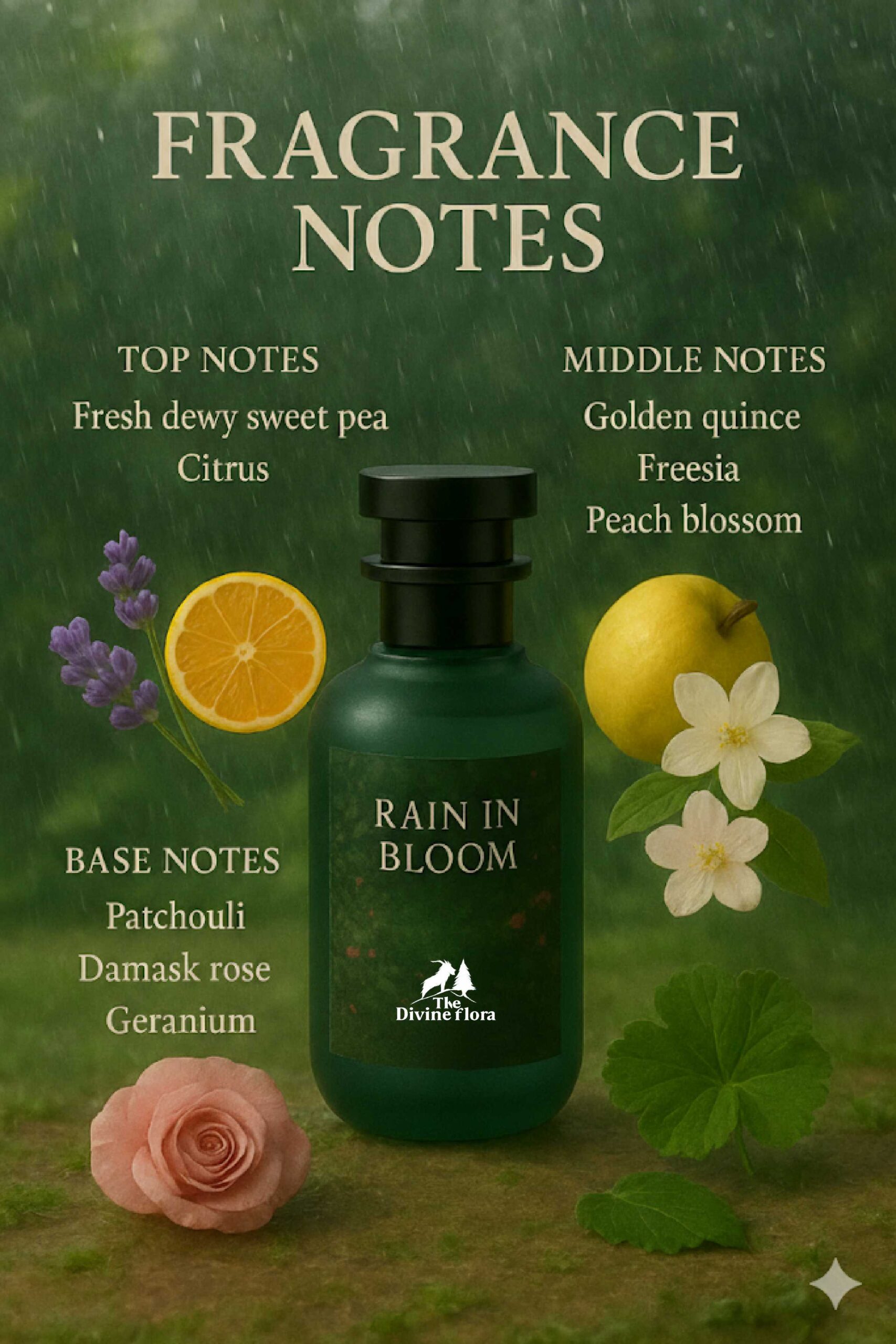 Rain in Bloom embodies the freshness of nature after rain. The opening of sweet pea and citrus awakens the senses, while freesia, golden quince, and peach blossom create a soft, floral heart. A refined base of damask rose, patchouli, and geranium adds depth and sophistication. Romantic, elegant, and timeless — it’s a scent that feels like wearing a spring morning.